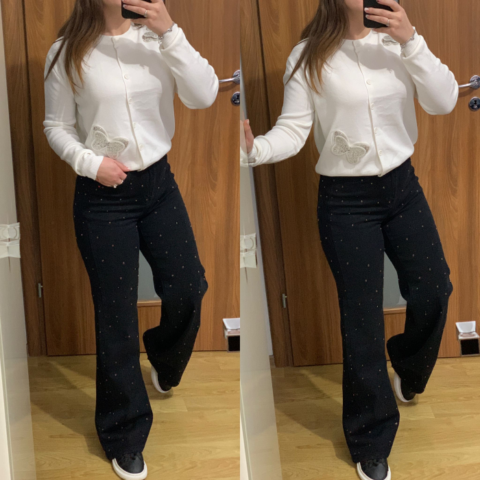 Set blugi negri evazati elastici cu pietricele+ pulover alb cu fluturasi 3D