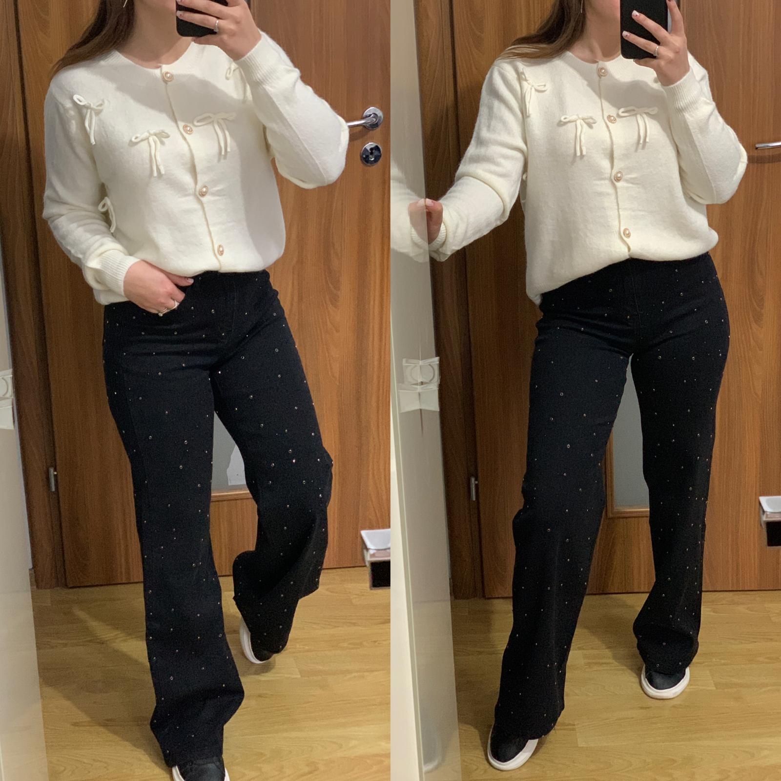 Set blugi negri evazati elastici cu pietricele+ pulover cu fundite
